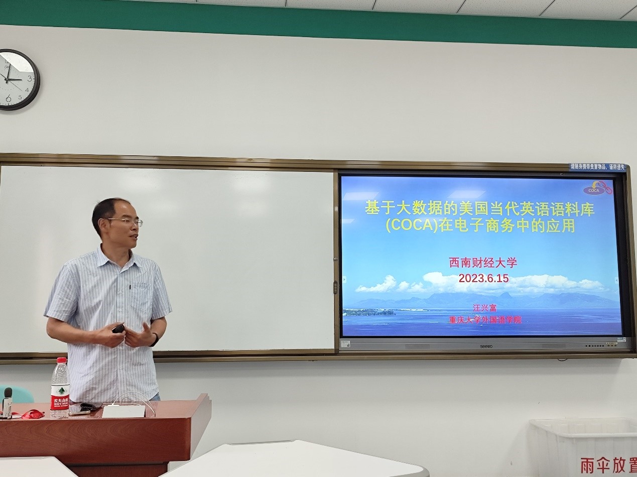 2023年6月15日,光华讲坛——社会名流与企业家论坛第6525期邀请了重庆大学外国语学院硕士生导师汪兴富副教授,为我校师生带来题为基于大数据的美国当代英语语料库在电子商务中的应用专题讲座。汪教授主要研究领域为认知语言学及语料库语言学方向,是国内学术界介绍COCA语料库的第一人。本次讲座由帅青红教授主持,电子商务本科生、管理科学与工程硕士研究生以及工商管理博士生参加此次讲座。