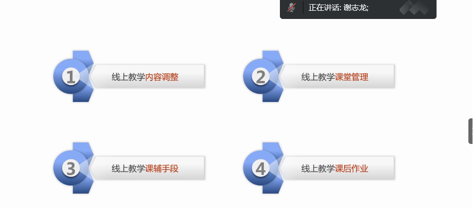 谢志龙老师从微观角度,以“Python程序设计课程”为例,从线上教学的内容调整、课堂管理、课辅手段、课后作业四个模块展开,分享其线上教学经验,例如利用“用与时俱进的案例吸引学生兴趣,多抛问题,利用练习调整课堂节奏,开启聊天框”等。同时,他建议教师们充分利用线上课程资源,巩固授课内容,增强学生的学习自主性,保障线上教学效果。