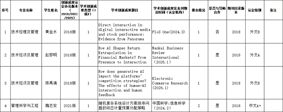 根据《努努书坊 博士生申请学位学术创新成果认定办法》和努努书坊 相应专业的博士生培养方案要求及科研成果发表的相关规定,学院对相关博士生的学术创新成果及科研情况进行了审核,现将结果予以公示。公示期15日,即自2026年4月14日至4月28日,在此期间若有异议,请及时反馈学院。