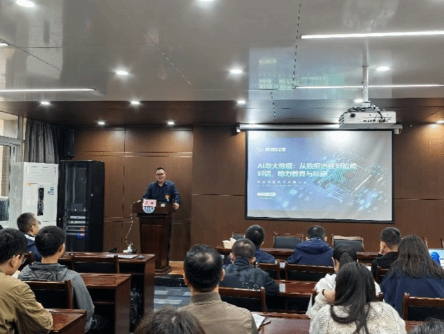 October 29 , 2024 , Wu Chao, Chairman of Chengdu Yingchao Technology Co., Ltd., a cooperative unit of our school, was invited to give a special lecture on " AI and Big Data: From Data Governance to Intelligent Dialogue, Assisting Education and Scientific Research". Wu Chao is an expert in "Rural E-commerce" of the Ministry of Commerce, an expert in "Big Data" of the National Bureau of Statistics, a member of the "High-level Expert Pool" of the Organization Department of the Sichuan Provincial Party Committee, an expert in "Big Data Innovation Statistics" of the Sichuan Provincial Bureau of Statistics, the head of the Sichuan E-commerce Big Data Center, and the chairman and general manager of Yingchao Technology Co., Ltd.